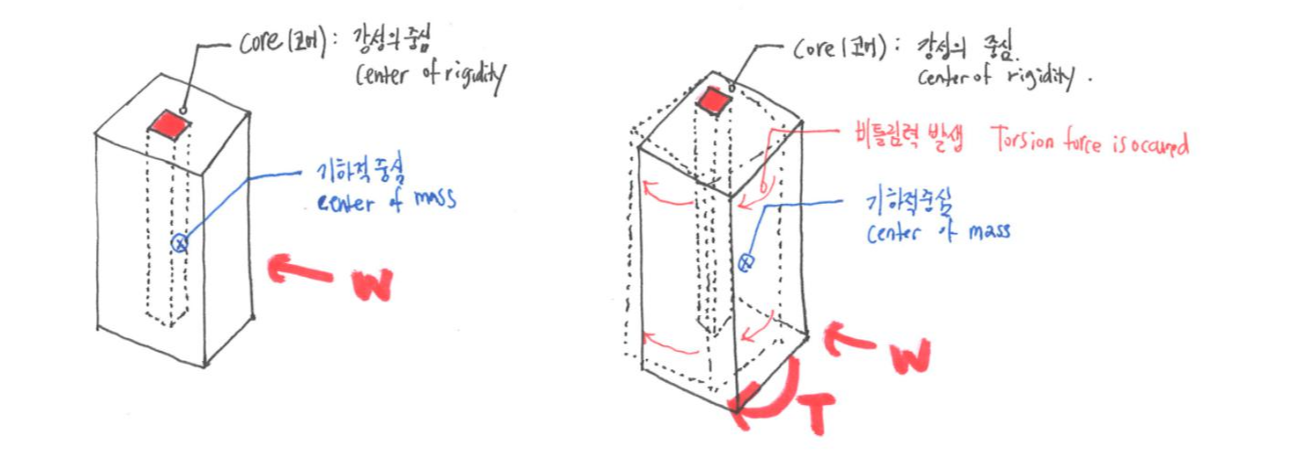건축에서 발생하는 비틀림력은 땅에 굳건히 자리 잡은 건물들의 중심이 일치하지 않을 때 외부의 하중에 대해서 저항하며 발생한다. 보통 풍력은 건물의 기하학적 중심 center of geometry, 지진력은 질량의 중심 center of mass에 가해지는 반면 건물의 강성의 중심 center of rigidity 은 건물의 단단한 심인 수직 코어 주변에 배치된다. ³ 이 세 중심이 일치한다면 외부 하중에 문제없이 견딜 수 있을 테지만, 중심이 일치하지 않으면 비틀림력이 발생할 수 있다. 예를 들어 코어가 한쪽 코너에 몰려 있는 경우를 생각해보자. 이때 풍하중은 건물의 기하적 중심에 가해진다. 그러나 건물은 코너에 꽉 붙잡혀 있는 상황이니, 코너를 마치 힌지로 하여 건물의 기하적 중심을 돌리려는 상황이 되는 것이다. 이러한 이유에서 고층 빌딩의 경우 건물의 코어가 생뚱맞게 배치되기 어려운 구조이나, 필요한 경우 댐퍼와 같은 기계 장치를 달아 건물의 중심이 하중에 의해 옮겨지려고 할 때마다 중심을 재배치하는 도구를 사용하기도 한다.