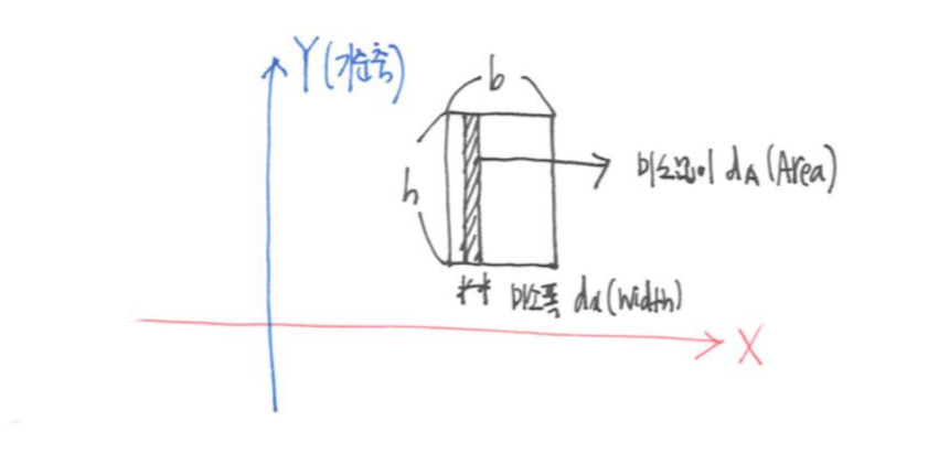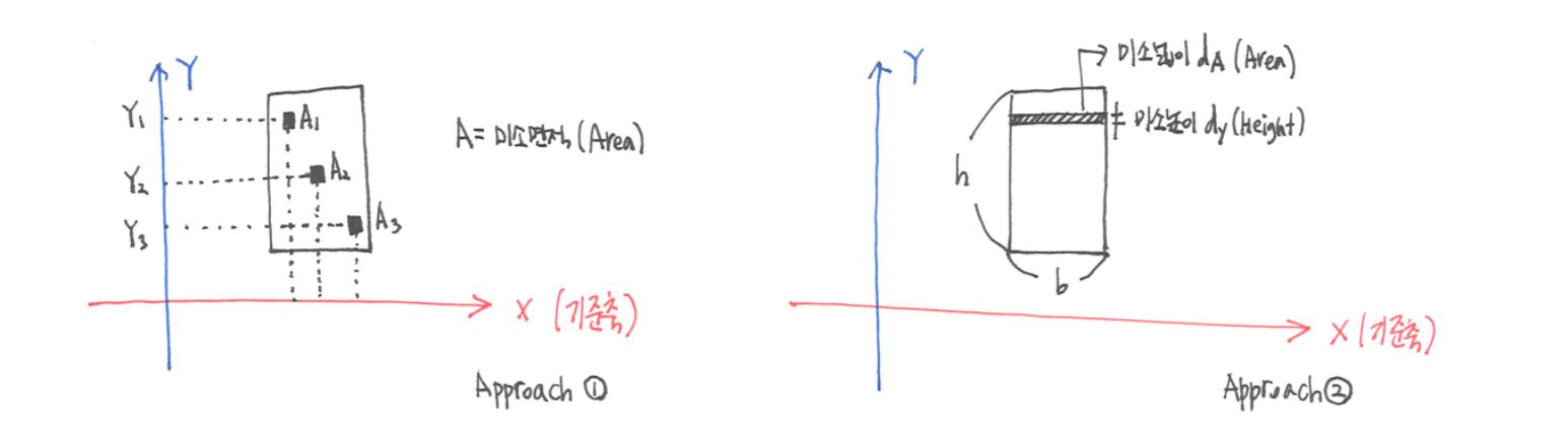 그러나 이 방법으로는 좀 더 나아간 결말을 얻지 못한다. 따라서 두번째두 번째 방법이 등장한다. 두 번째 방법은 단면적을 첫 번째와 같이 작은 미소 사각형으로 나누는 것이 아니라 직사각형의 너비 b를 온전히 갖는 미소 띠로 해석하는 것이다. 이렇게 너비 b와 미소 높이 dy의 미소 띠 면적을 dA라고 하면, 아래와 같은 식이 성립한다.