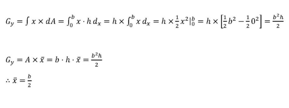 Y축에 대한 단면 1차 모멘트를 X축에 대한 단면 1차 모멘트를 구했던 것과 같은 방법으로 구해보면, 다음과 같은 식이 성립한다. 결과적으로 X 의 평균값, 즉 Y 축과 도심에서의 거리는 b/2로 역시 우리의 직관과 일치한다.
