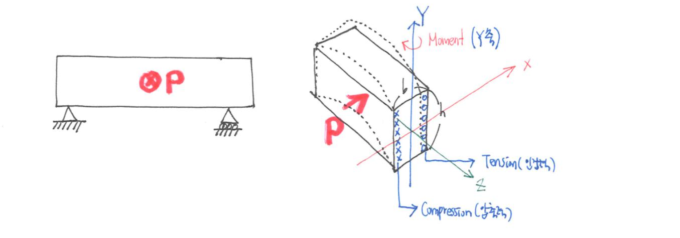 하지만 간과하지 말아야 할 것은 Y 축에서의 모멘트이다. 다음으로 보에 수평 하중이 작용하는 상황을 생각해보자. 단순보를 입면에서 보았을 때 수평 방향의 하중 P가 스케치에서와 같이 가해질 것이다. 이 상황을 입체적으로 파악해보면, 여기서의 보는 Y축에서의 모멘트를 받고 있는 것을 알 수 있다.