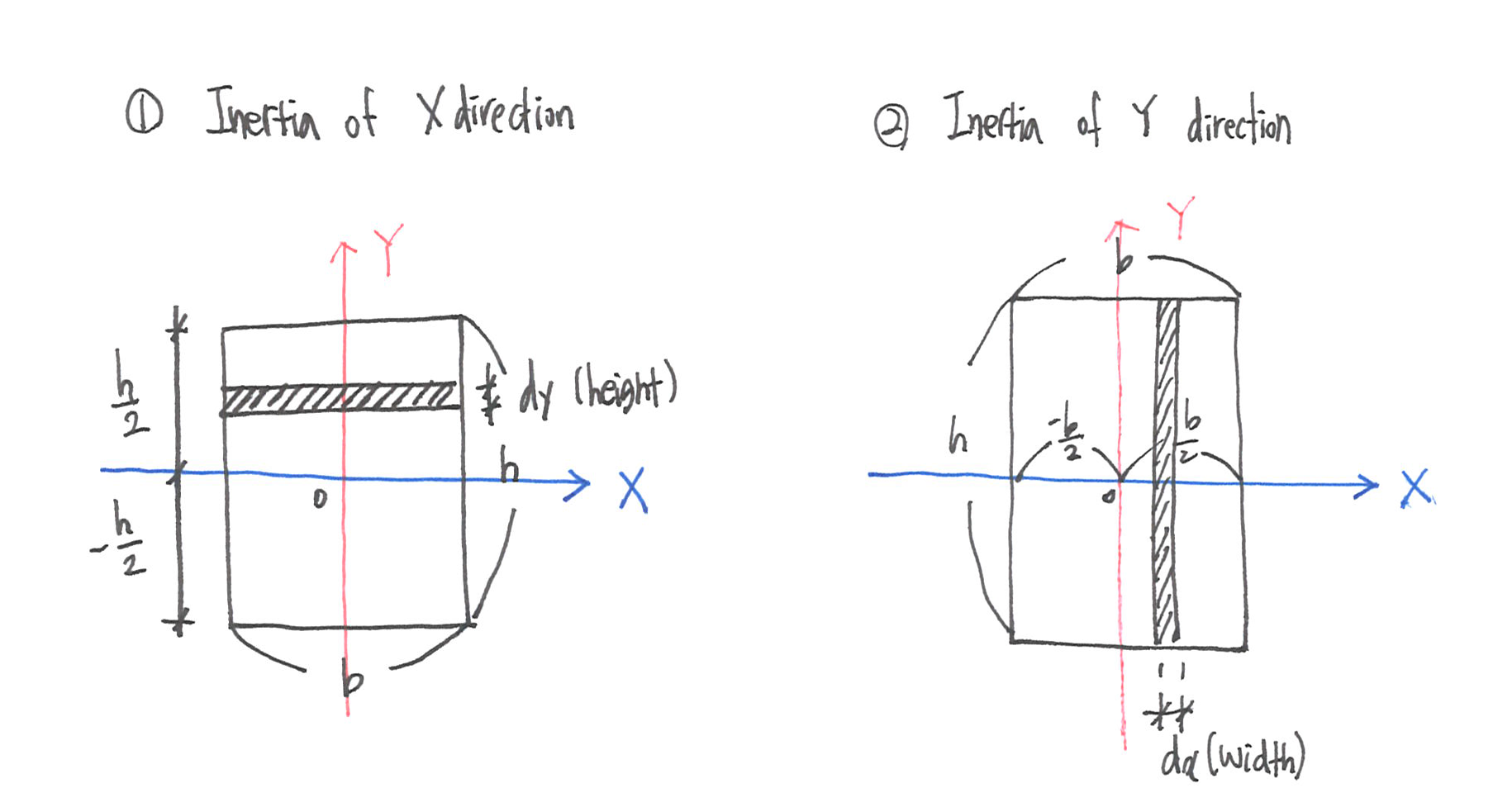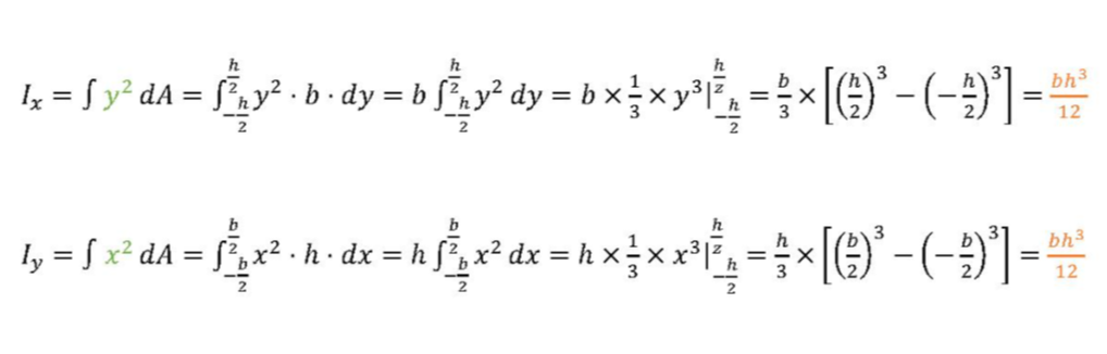 X, Y 축에 대해 단면 1차 모멘트를 구했던 방법과 동일하게 두 축에 대한 단면 2차 모멘트를 구해보면, 아래와 같은 식과 결과가 나온다.