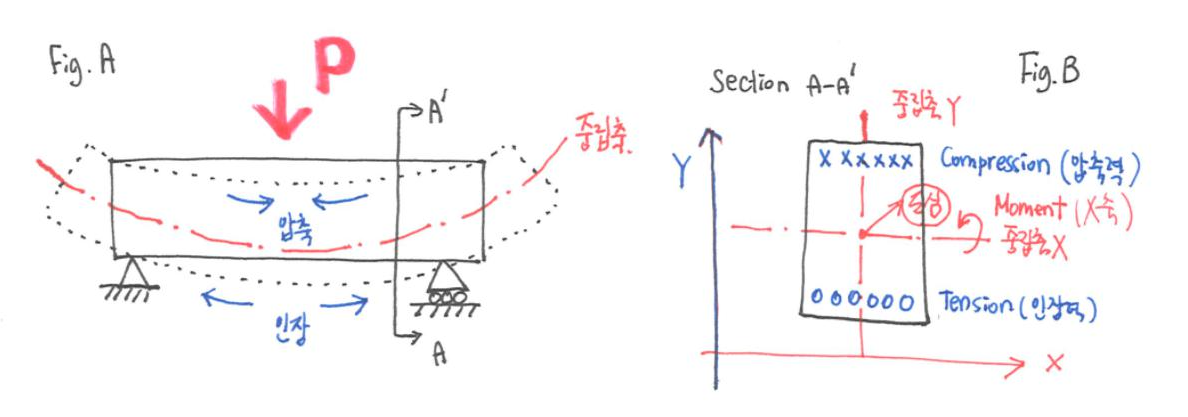 스케치 A와 같은 단순보가 있는데, 하중이 위에서 작용하고 있는 상황을 상상해보자. 그렇다면 하중에 의해 보에는 상부에는 압축력, 하부에는 인장력이 걸리게 된다. 그런데, 스케치에서도 알 수 있듯이 압축력과 인장력이 중간에서 교차되는 지점이 있다. 바로 이 부분을 중립 축이라고 부르며 압축력과 인장력이 모두 0이 되는 지점이다.