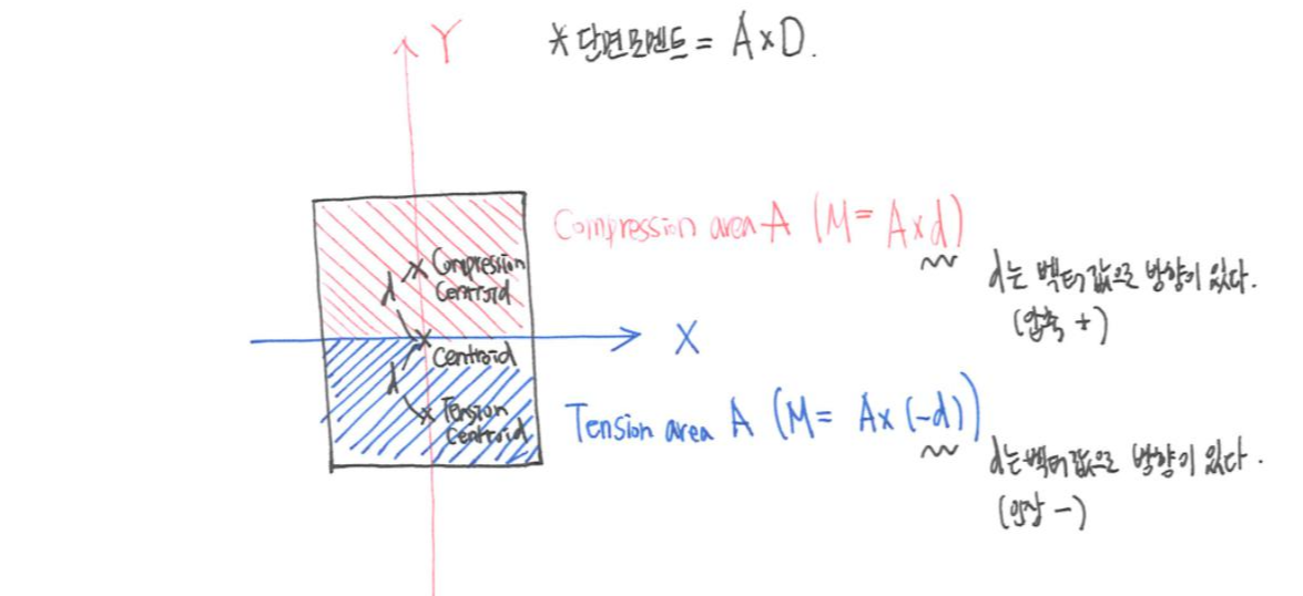 M = A x D (M = 단면 모멘트, A = 단면적, D = 축에서 도심까지의 거리)