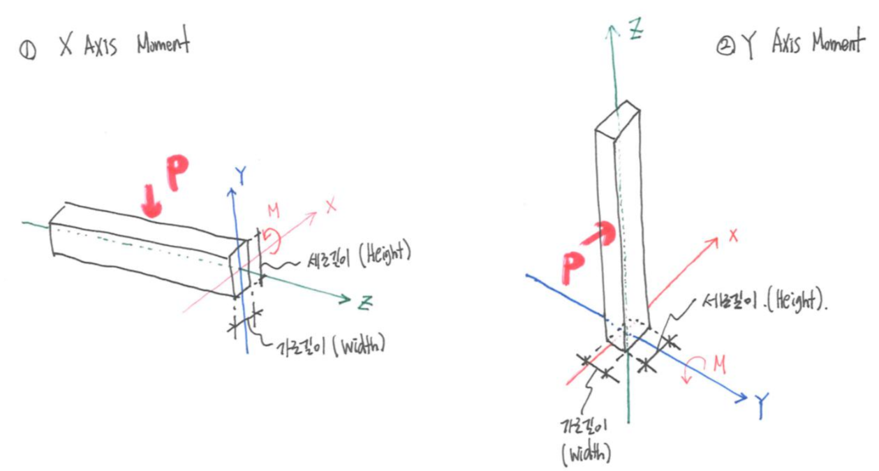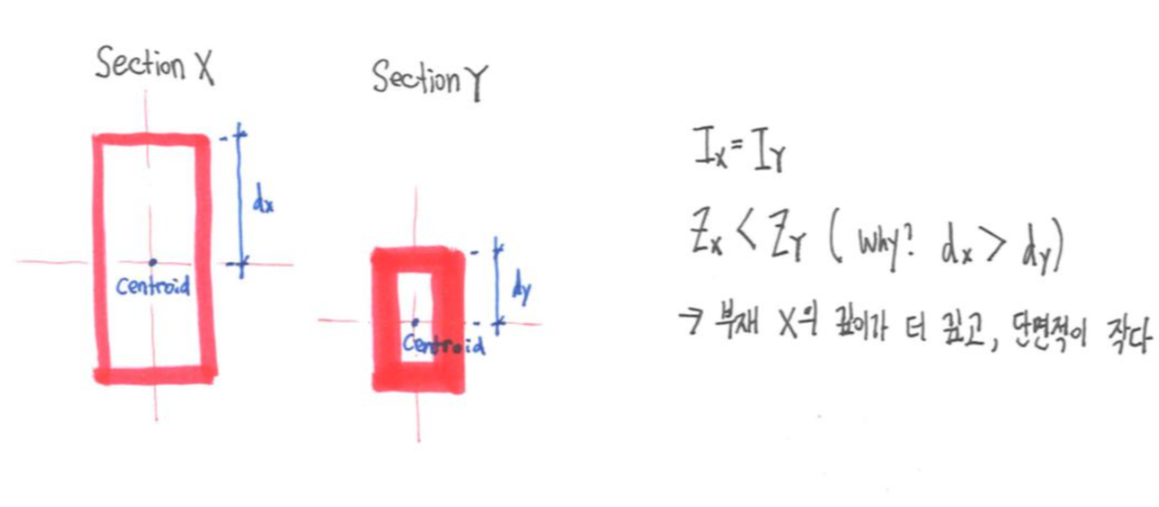 그러나 두 경우에 대해서 모멘트가 가해지는 축과 평행한 길이를 가로 길이, 모멘트가 가해지는 축과 수직 되는 길이를 세로 길이라고 한다면, 모두 세로 길이에 대해 단면 모멘트가 세제곱으로 커지는 것으로 정리할 수 있다. 부재 설계 시 기억해야 할 것은, 모멘트가 가해지는 축에 수직 되는 방향의 길이가 길면 길수록 단면 모멘트가 커지고, 단면 성능도 월등히 좋아지는 것이다.