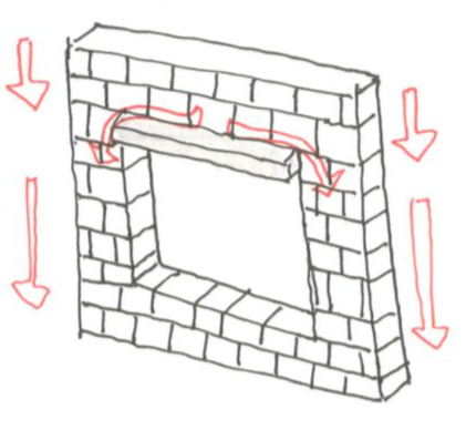 If you think of a lintel as a solid stick on top of an opening, it will work. In other words, I'll call it a horizontal member on top of the openings. The lintel bears upper loads and then transfers load downward. By distributing the load toward around the opening, we can create the opening on the wall.