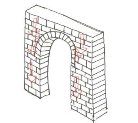 The second method is arch. Arches are a wonderful form. The force coming down from the top of the opening is transferred to the bottom along with the shape of the arch. Arches do not require special additional elements to create openings. The well-proportioned form alone can distribute the force well and deliver it to the bottom. Isn't it amazing? Compression forces applied between the arched bricks, make it possible to transfer forces along with the shape.