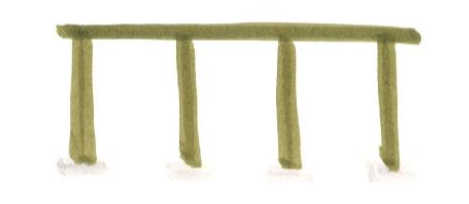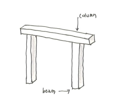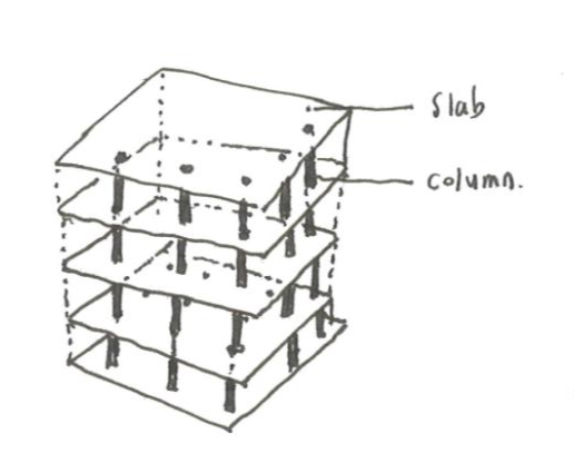 There are two basic structural elements in this system. One is a pillar, the other is beams. Pillars are a familiar concept to everyone. Beams are horizontal members that cross the column. If you look at the sketch above, there's a beam on the pillar. This is the most basic form of column-beam architectures.