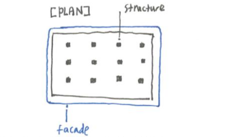 Let's look at the planar sketch above. Unlike the Masonry building, where the facade was directly a structure also, now the facade is located far away from the pillars and became a thin line that covers the boundary of a building.