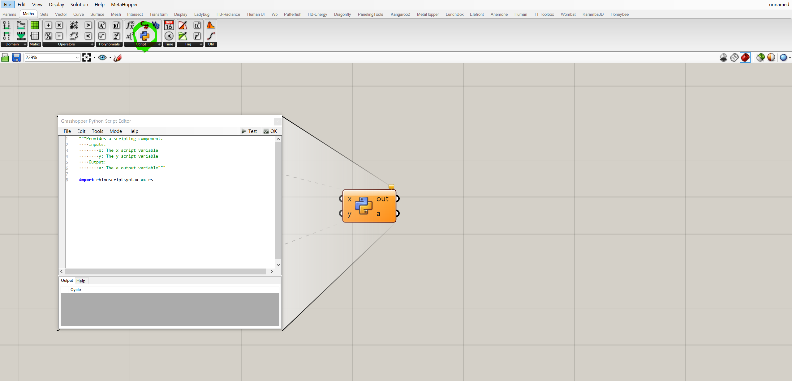 그래스호퍼에서 파이썬 컴포넌트를 불러와서(Math - Script 탭) 컴포넌트를 더블 클릭하면, 직접 스크립팅을 할 수 있는 창이 뜨는 데, 아래 이미지와 같다.