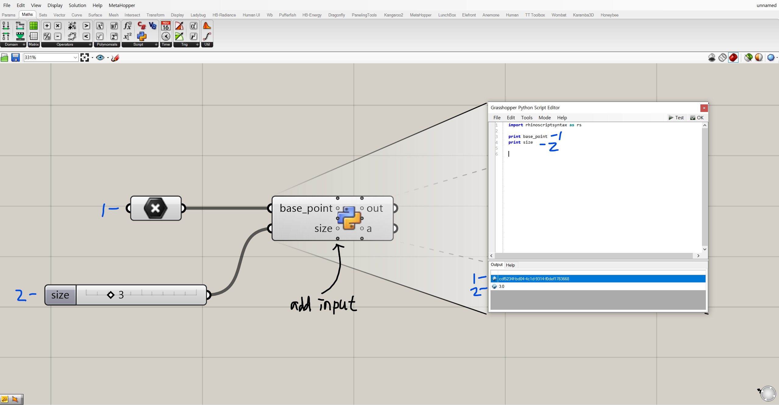 스크립팅을 하면서 라이노와 연동하여 사용하게 되는 변수(variables)와 인자(arguments) 들은 아래 이미지처럼 왼쪽의 + 버튼을 클릭해서 손쉽게 불러올 수 있다. 파이썬 스크립팅 컴포넌트에서 인풋의 이름을 print 하자 각각 포인트의 위치와 정수 3이 출력된 것을 확인할 수 있다.